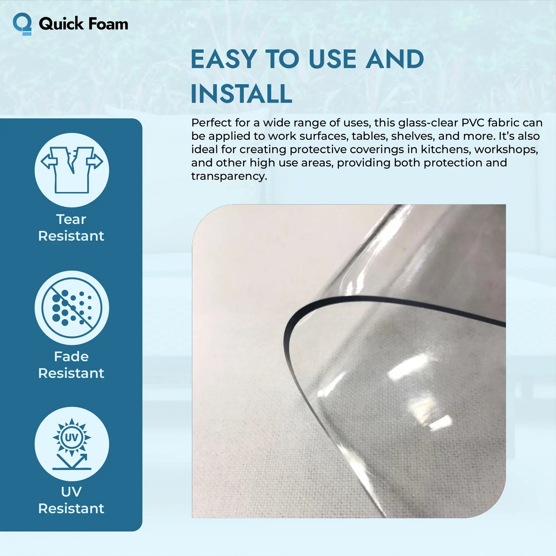 At Quick Foam, based in Tyseley, Birmingham, we specialise in custom foam solutions and high-quality protective materials. Our Heavy Duty Clear PVC Fabric is sold by the meter, allowing you to purchase the exact amount you need without waste. With years of expertise, we focus on quality, reliability, and customer satisfaction, ensuring every product meets the highest standards for durability and performance. Choose Quick Foam for trusted foam protection solutions in the UK.