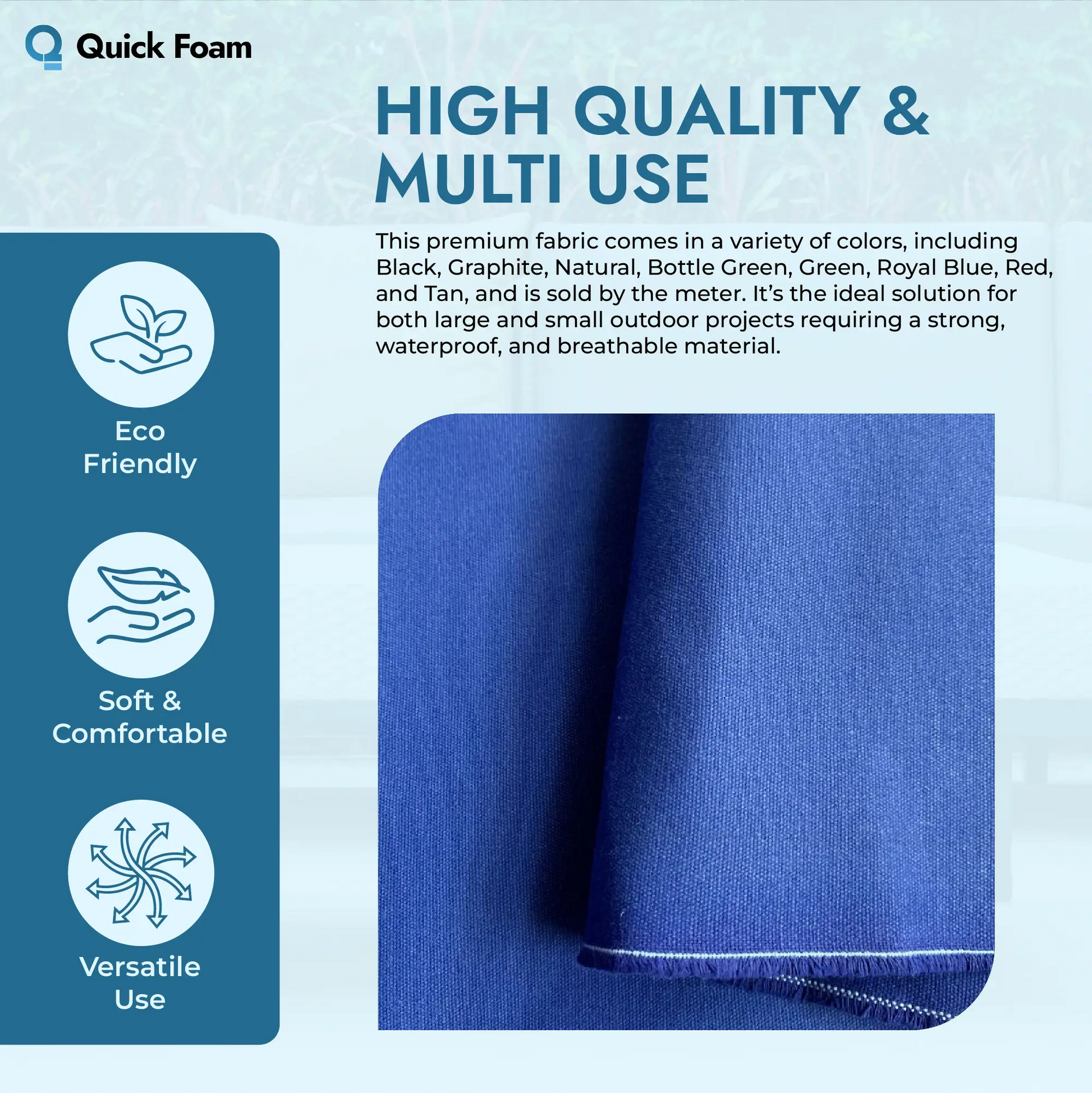 Quick Foam is a trusted Birmingham-based specialist known for precision, quality, and customer-focused service. Whether you're creating foam covers, outdoor cushion sets, or heavy-use protective panels, we supply reliable materials backed by expert support. Order by the metre, with continuous lengths provided and optional stitching services available for perfectly sized foam or mattress covers.