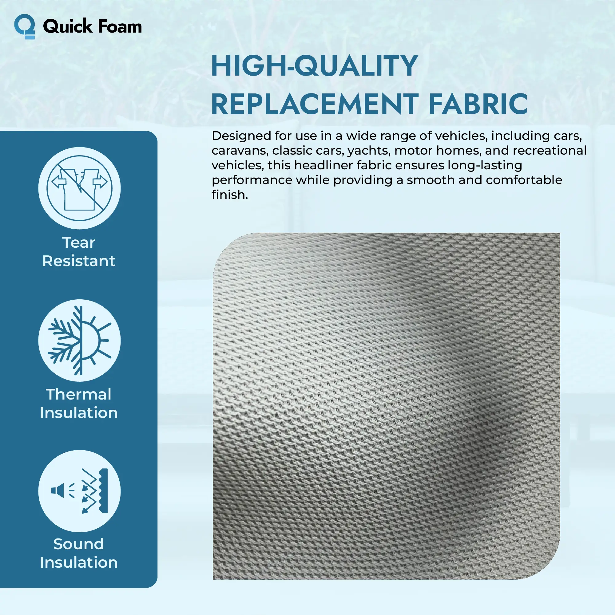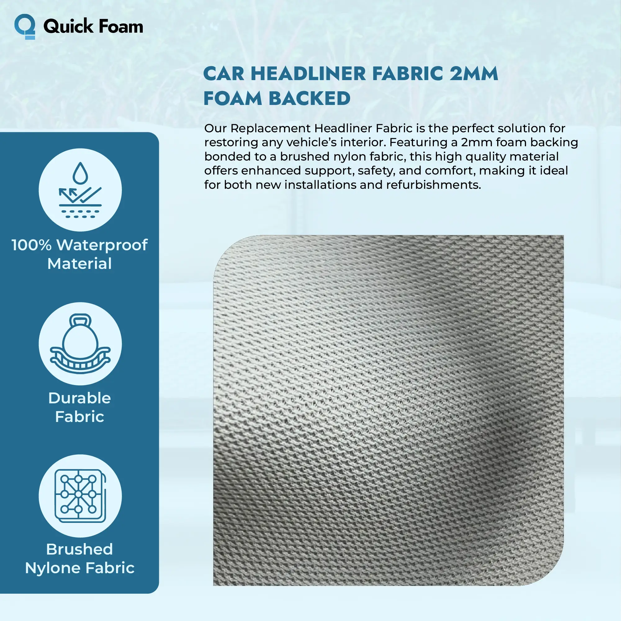 Carefully selected by Quick Foam, this headliner fabric meets high standards for durability and performance. Whether you’re carrying out a full interior restoration or a targeted repair, the material is designed to maintain its structure and appearance over time.