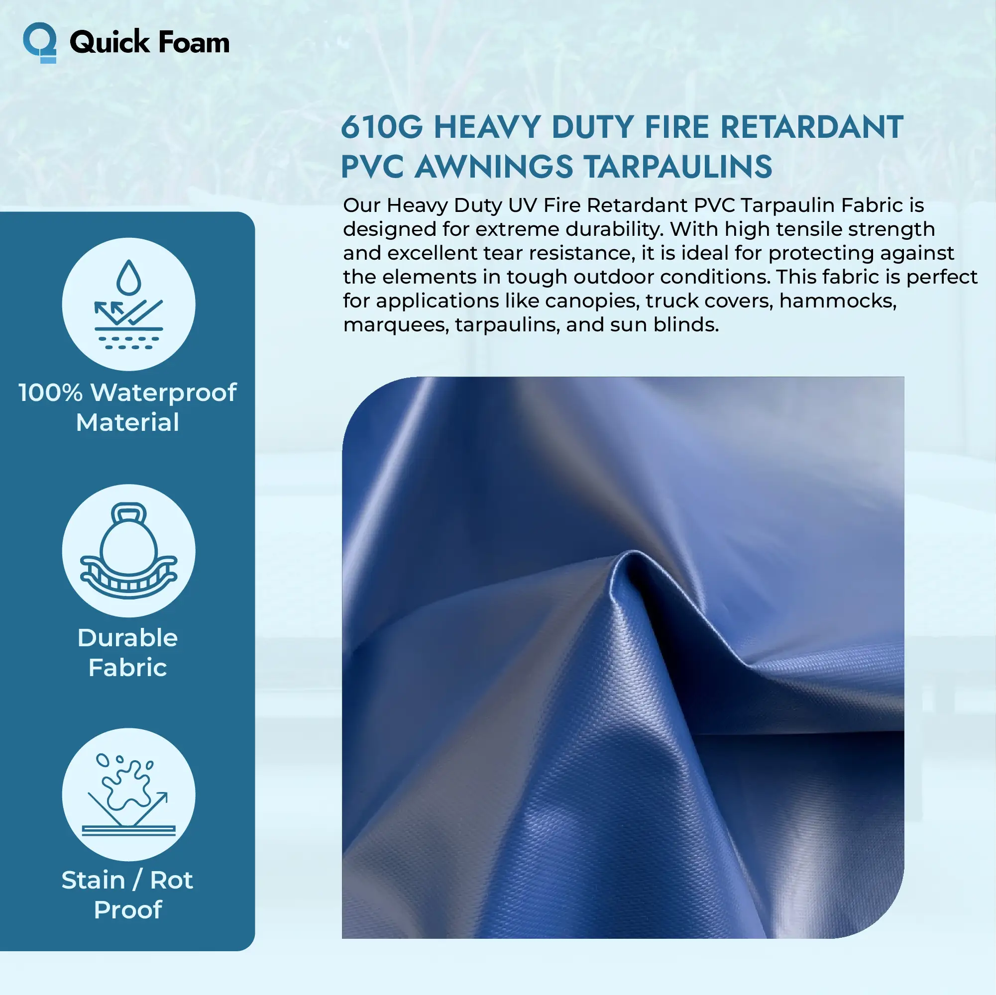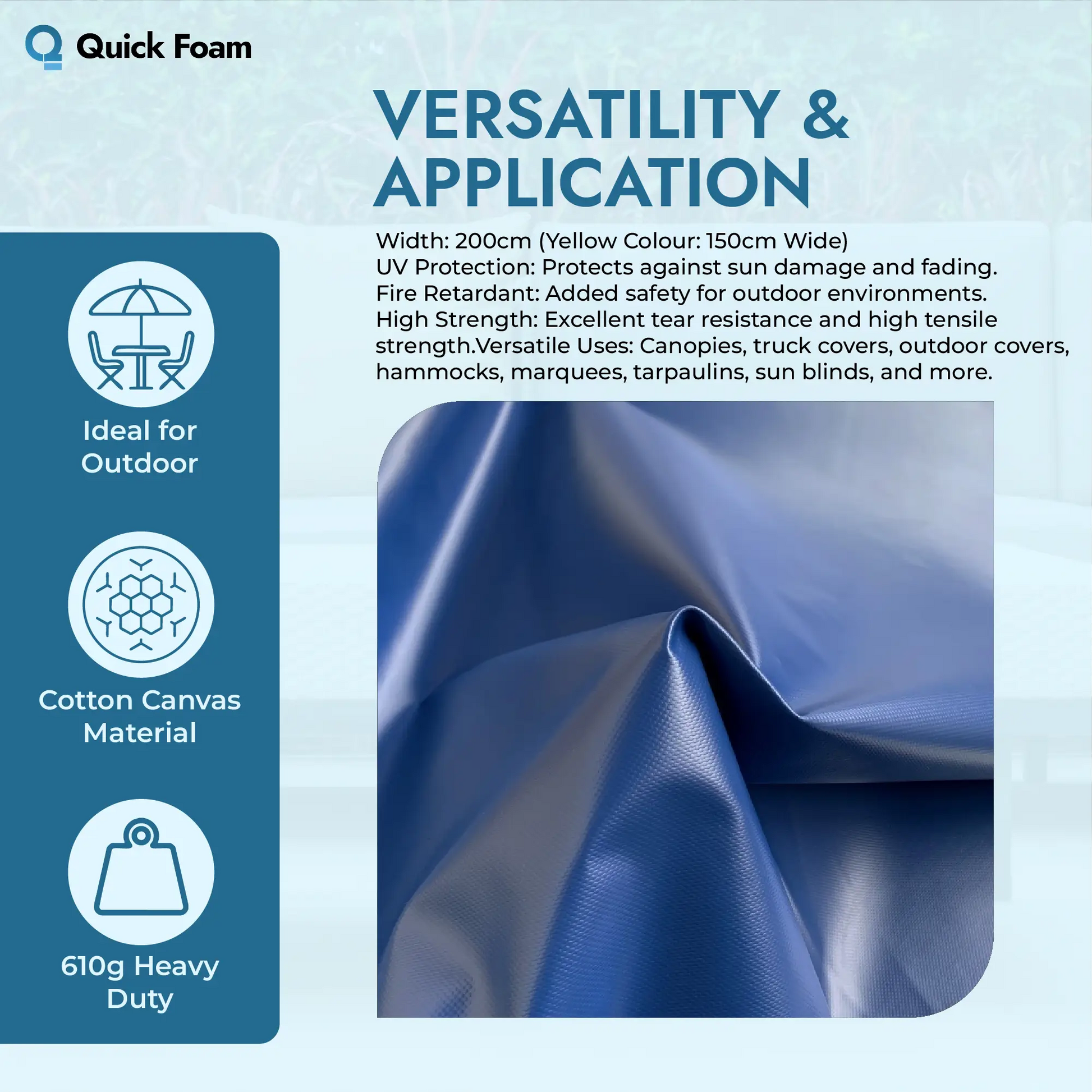 - Usage: Foam covers, mattress covers, outdoor seating, tarpaulins, truck curtains, canopies & more