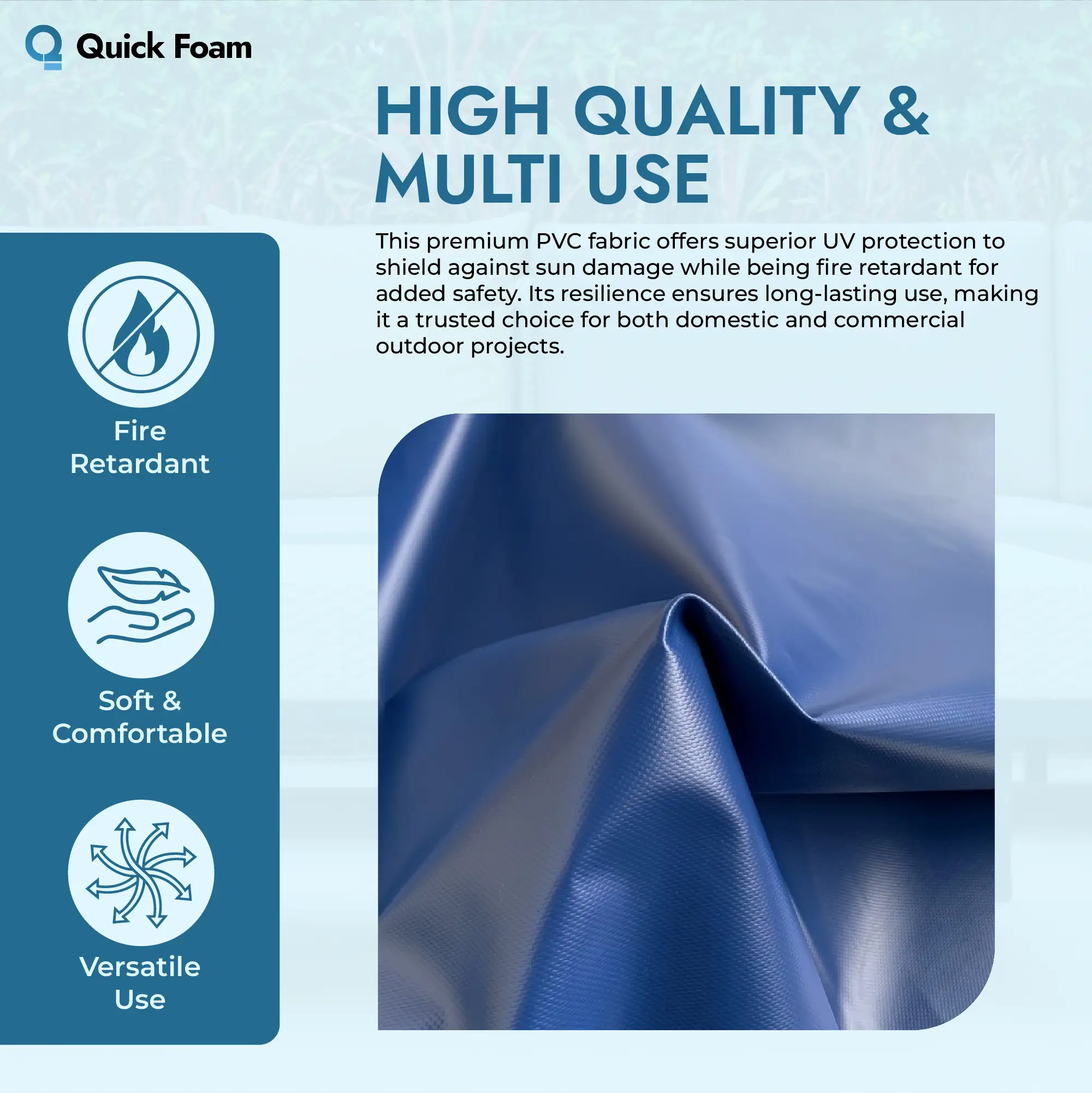 At Quick Foam, we specialise in supplying high-quality materials designed to protect and enhance custom foam solutions. This 610g PVC is selected for its proven durability, reliable fire-retardant performance, and suitability for foam and mattress cover projects. Customers choose us for dependable materials, friendly support, and fast service from our Birmingham-based team.