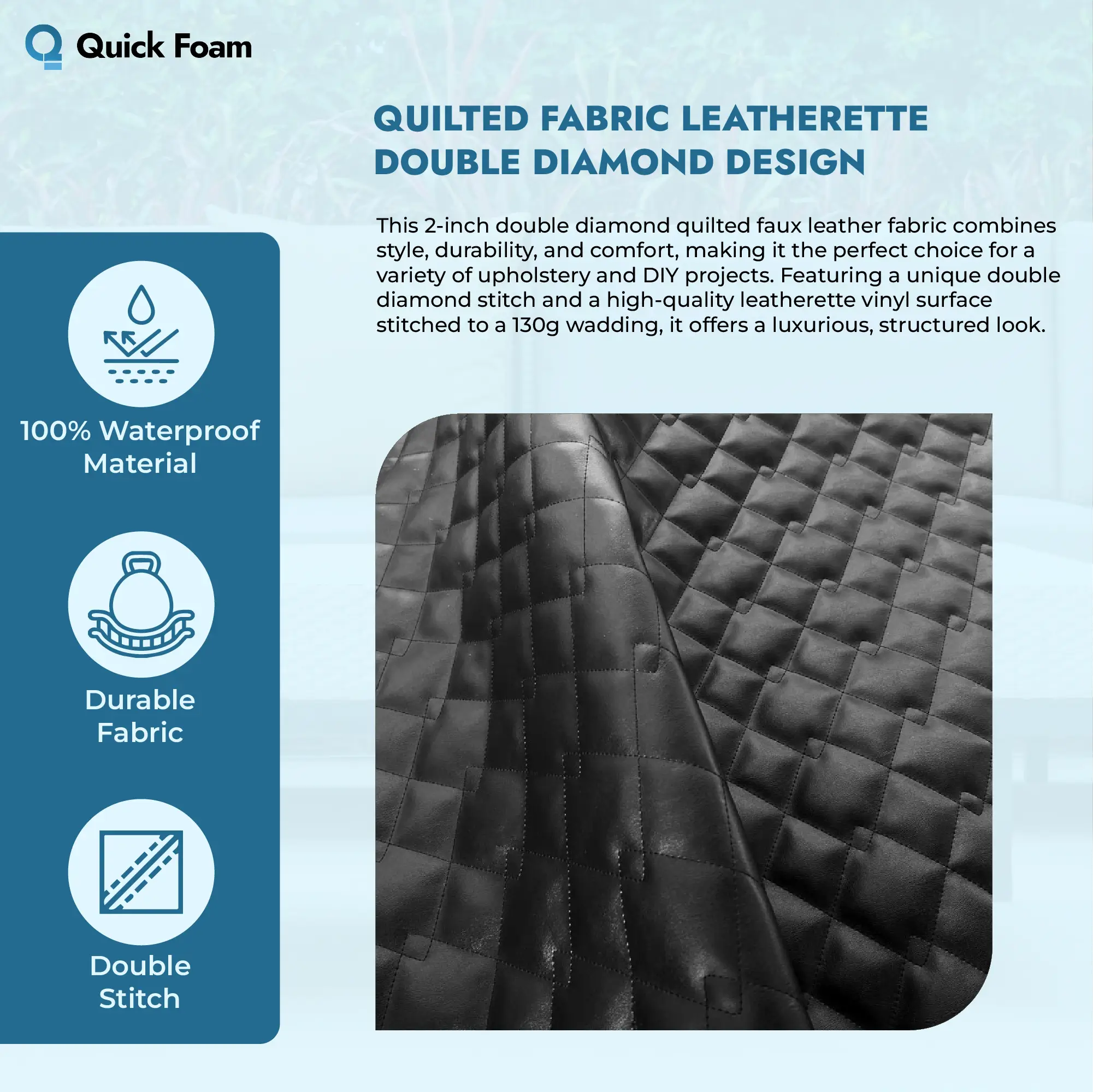 At Quick Foam, based in Tyseley, Birmingham, we specialise in custom foam solutions designed to meet your specific needs. Our expertise ensures that each fabric and foam combination offers maximum durability, comfort, and style. When you choose our Quilted Fabric Leatherette Double Diamond Design for your mattress or foam projects, you’re investing in a premium product backed by quality craftsmanship and exceptional customer service.