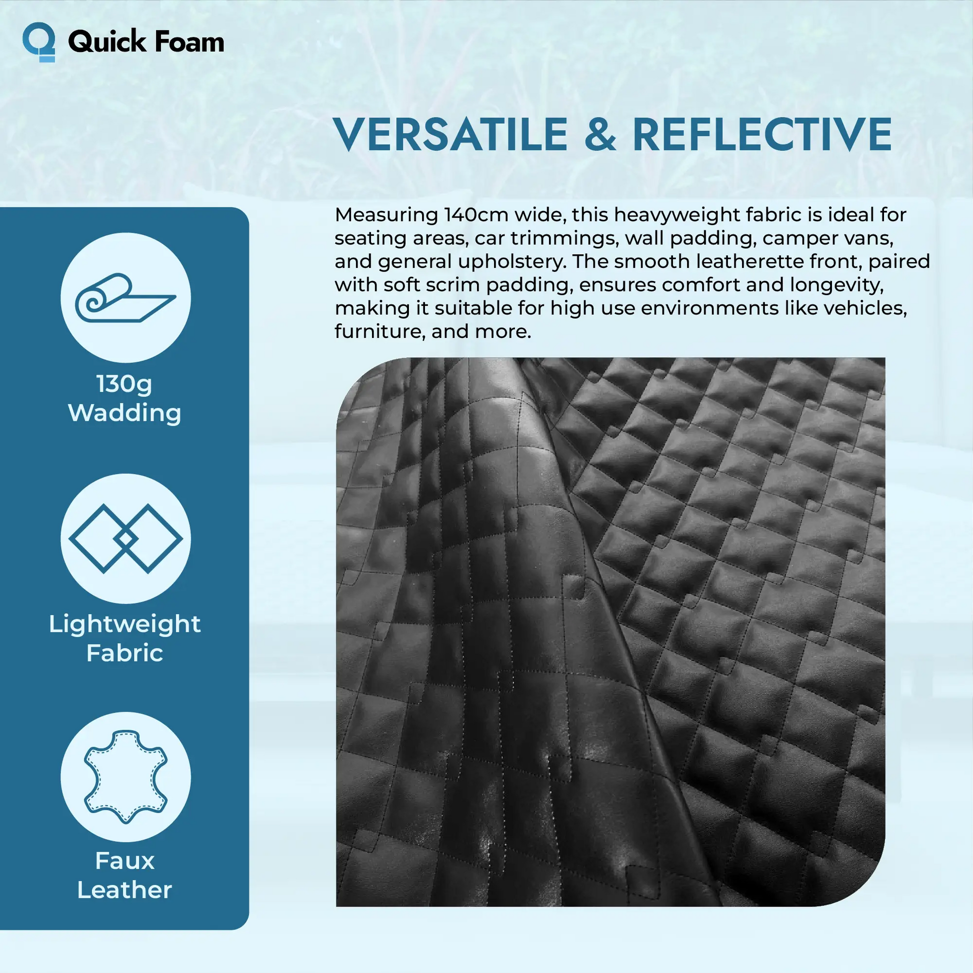 Crafted with a smooth leatherette vinyl surface and a soft 130g wadding backing, it ensures your foam projects are both comfortable and resilient. Whether for mattresses, cushions, or upholstered panels, this fabric delivers a high-end finish.