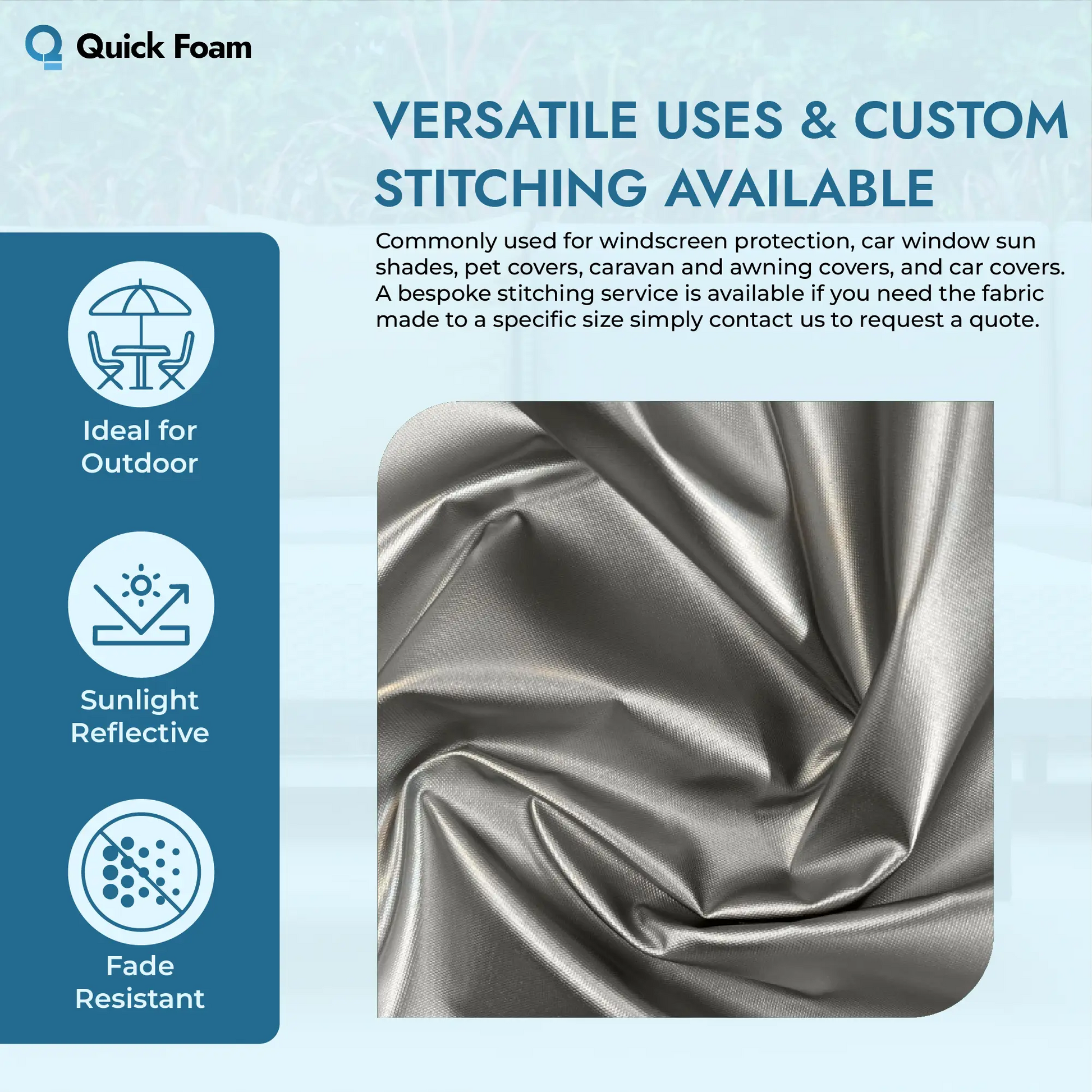 At Quick Foam in Tyseley, Birmingham, we specialise in creating high-quality, made-to-measure foam and cover solutions. Our sunlight reflective fabric complements our foam range perfectly, offering a dependable way to protect your investment. Customers choose us for our: