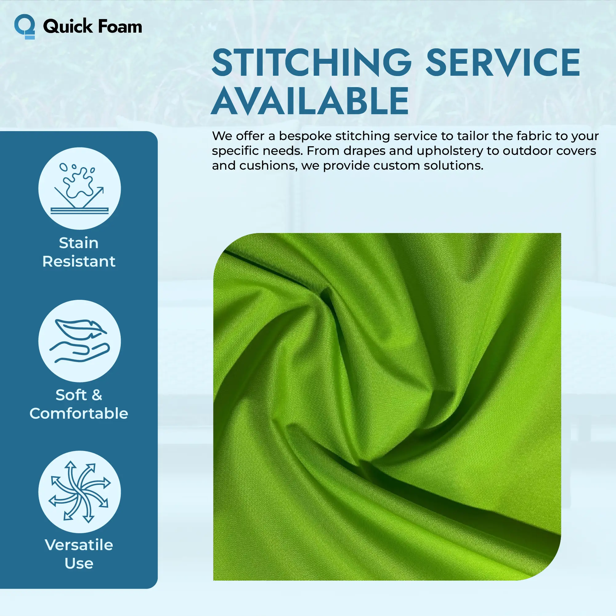 For customers needing a precise fit, we offer a convenient stitching service for foam and fabric projects. Whether you're covering garden seating, creating bespoke cushion sets, or protecting specialised foam inserts, we can cut and stitch the fabric to your required dimensions.